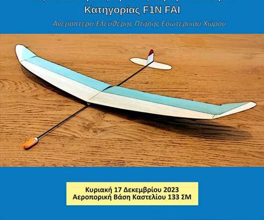 Η Ελληνική Αεραθλητική Ομοσπονδία με την υποστήριξη της Περιφέρειας Κρήτης πραγματοποιεί την Κυριακή 17 Δεκεμβρίου στην αεροπορική βάση Καστελίου 133 ΣΜ τον 1ο πανελλήνιο αγώνα αερομοντελισμού κλειστού χώρου κατηγορίας F1N FAI.