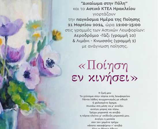 Η Ομάδα Πολιτισμού των Εθελοντών της Παράταξης «Δικαίωμα στην Πόλη» σε συνεργασία με το Αστικό ΚΤΕΛ Ηρακλείου και με αφορμή την Παγκόσμια Ημέρα Ποίησης, διοργανώνουν ανάγνωση ποιημάτων με τίτλο: «Ποίηση εν κινήσει», την Πέμπτη 21 Μαρτίου, από τις 12:00 έως τις 15:00, στις γραμμές 2 (Λιμάνι-Κνωσός) και 10 (Αεροδρόμιο – Γάζι) των αστικών λεωφορείων.
