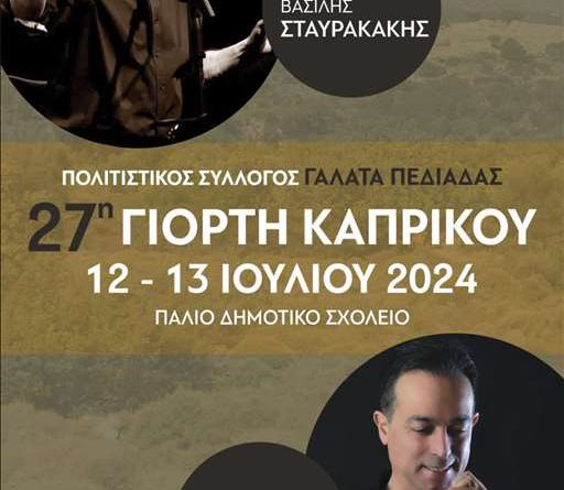 Ο Πολιτιστικός Σύλλογος Γαλατά Πεδιάδος διοργανώνει την «27η γιορτή Καπρικού» την Παρασκευή 12 και το Σάββατο 13 Ιουλίου στην αυλή του παλιού Δημοτικού Σχολείου.