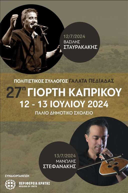 Ο Πολιτιστικός Σύλλογος Γαλατά Πεδιάδος διοργανώνει την «27η γιορτή Καπρικού» την Παρασκευή 12 και το Σάββατο 13 Ιουλίου στην αυλή του παλιού Δημοτικού Σχολείου.
