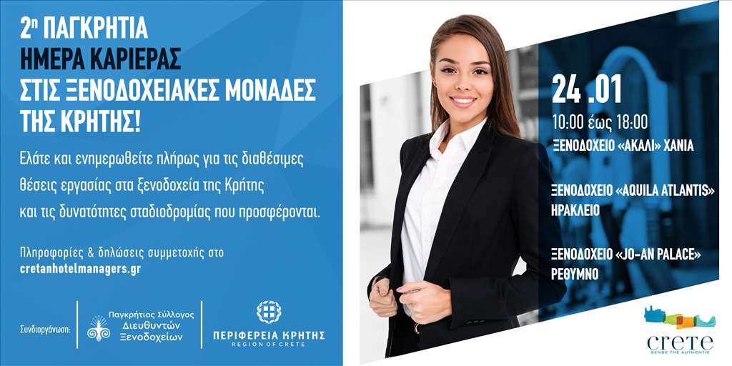 Ο Παγκρήτιος Σύλλογος Διευθυντών Ξενοδοχείων και η Περιφέρεια Κρήτης, αναγνωρίζοντας τη σημασία που έχει ο Τουρισμός στην Κρήτη, αλλά και οι μεγάλες δυνατότητες που προσφέρει ο ξενοδοχειακός κλάδος του νησιού μας στον τομέα της εργασίας, συνδιοργανώνουν την «2η Παγκρήτια ημέρα καριέρας στις Ξενοδοχειακές μονάδες της Κρήτης».