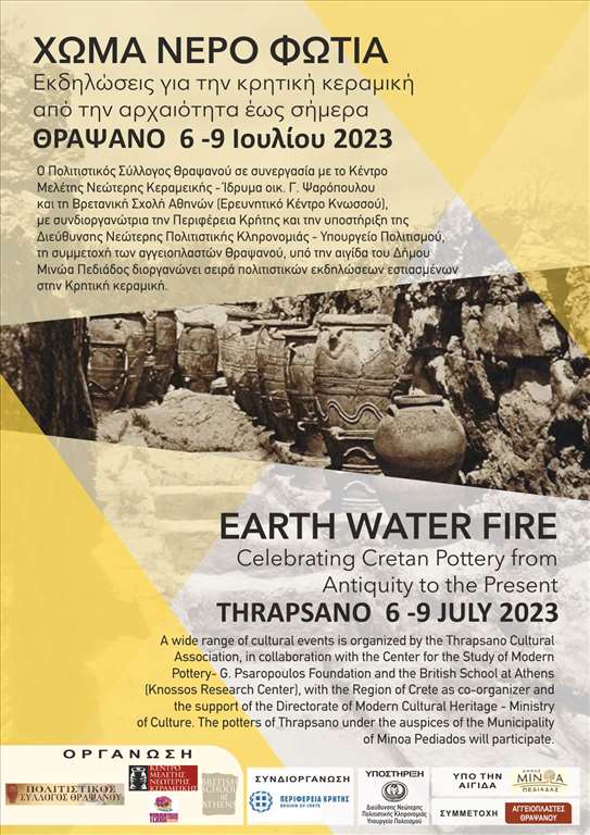 Ο Πολιτιστικός Σύλλογος Θραψανού η Βρετανική Σχολή Αθηνών, το Κέντρο Μελέτης Νεότερης Κεραμικής , με συνδιοργάνωση την Περιφέρεια Κρήτης την στήριξη του Υπουργείου Πολιτισμού των Αγγειοπλαστών του Θραψανού, διοργανώνει σειρά πολιτιστικών εκδηλώσεων εστιασμένων στην Κρητική παραδοσιακή κεραμική και τον πολιτισμό της Κρήτης, υπό την αιγίδα του δήμου Μινώα Πεδιάδας.