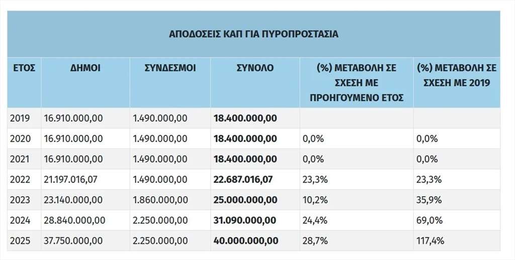 Χρηματοδότηση ύψους 40 εκ. ευρώ, αυξημένη κατά 9 εκ. ευρώ (28,6%) σε σχέση με το 2024, διατίθεται από το Υπουργείο Εσωτερικών προς τους Δήμους και τους Συνδέσμους τους για την υλοποίηση δράσεων πυροπροστασίας το 2025.