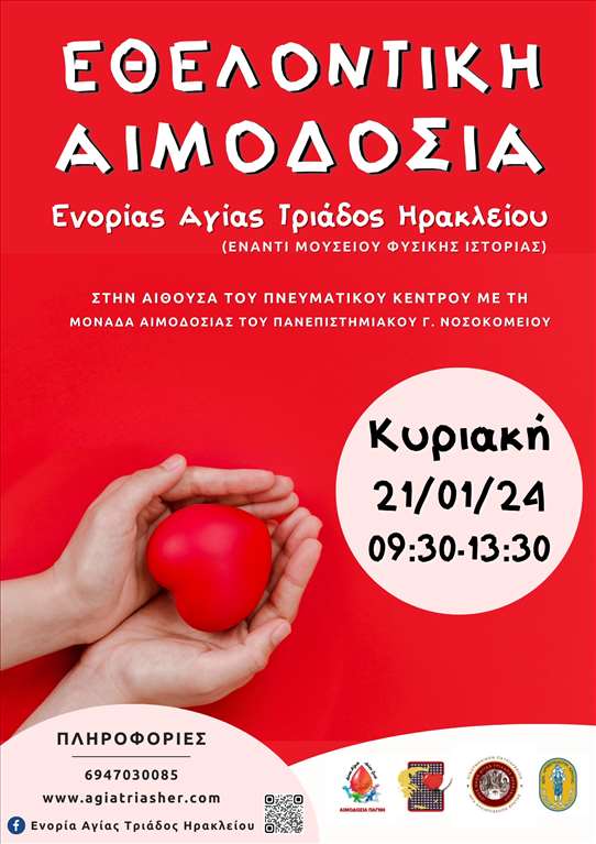 Την Κυριακή 21 Ιανουαρίου και ώρα 09:30 π.μ. έως 13:30 μ.μ., στην αίθουσα του Πνευματικού & Νεανικού Κέντρου Ενορίας Αγίας Τριάδος Ηρακλείου Κρήτης, διοργανώνουμε την 5η Εθελοντική μας Αιμοδοσία.