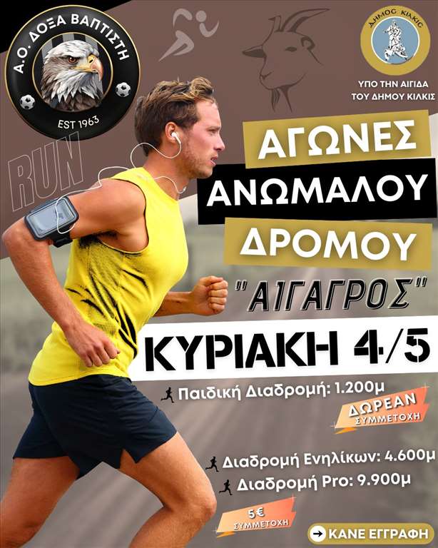 Ο Αθλητικός Όμιλος ‘’Δόξα’’ Βαπτιστή πραγματοποιεί την 6η διοργάνωση αγώνων σε ανώμαλο δρόμο ‘’Αίγαγρος’’ για μικρούς και μεγάλους, την Κυριακή 4 Μαϊου και απευθύνει ανοιχτή πρόσκληση συμμετοχής.