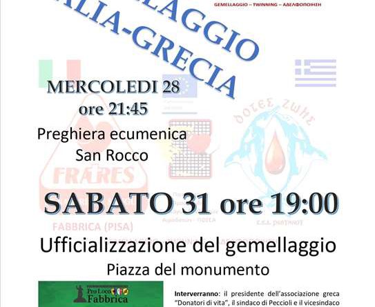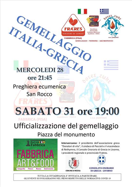 Ελληνική αντιπροσωπεία θα ταξιδέψει την Τετάρτη 28 Ιουλίου για την Fabbrica του Δήμου Πεσκιόλι της Ιταλίας ώστε να παρευρεθεί το Σάββατο, 31 Ιουλίου 2021 στην επίσημη τελετή Αδελφοποίησης με τον Σύλλογο Εθελοντών Αιμοδοτών Τοσκάνης «Frates Blood Donors Group», με την υποστήριξη της Περιφερειακής Ενότητας Ρεθύμνου και του Δήμου Ρεθύμνης.
