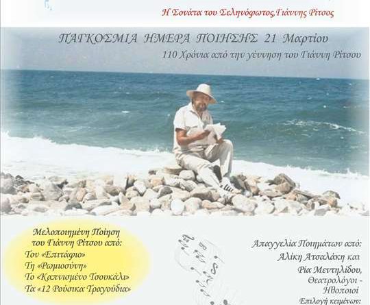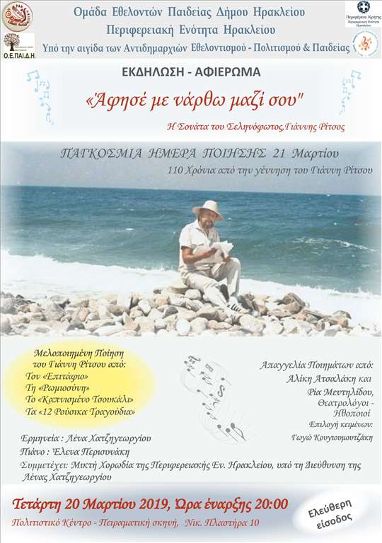 Με αφορμή την Παγκόσμια Ημέρα Ποίησης η Ομάδα Εθελοντών Παιδείας του Δήμου Ηρακλείου υπό την αιγίδα των Αντιδημαρχιών Εθελοντισμού – Πολιτισμού και Παιδείας σε συνεργασία με την Περιφερειακή Ενότητα Ηρακλείου, οργανώνει εκδήλωση-αφιέρωμα στον ποιητή Γιάννη Ρίτσο για τα 110 χρόνια από τη γέννησή του, με τίτλο: «Άφησέ με νάρθω μαζί σου» – Η Σονάτα του Σεληνόφωτος, Γιάννης Ρίτσος