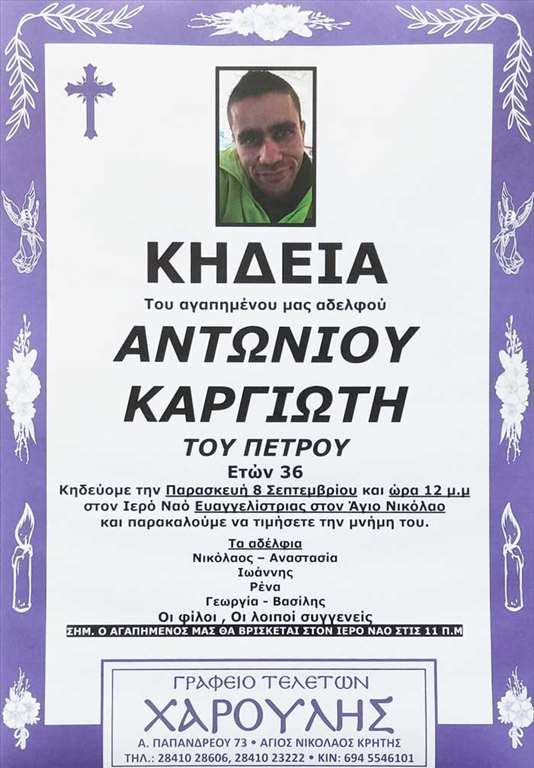 Άγιος Νικόλαος: Στις 12 η κηδεία του 36χρονου Αντώνη Καργιώτη