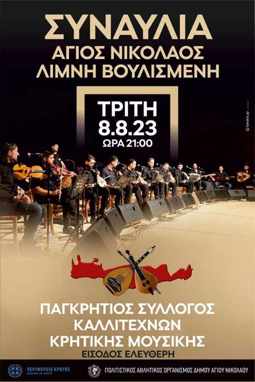 Ο Παγκρήτιος Σύλλογος Καλλιτεχνών Κρητικής Μουσικής θα πραγματοποιήσει συναυλία Κρητικής μουσικής με μελωδίες και τραγούδια από ολόκληρο το νησί, την Τρίτη 8 Αυγούστου και ώρα 21:00 στη Λίμνη Βουλισμένη στον Άγιο Νικόλαο.