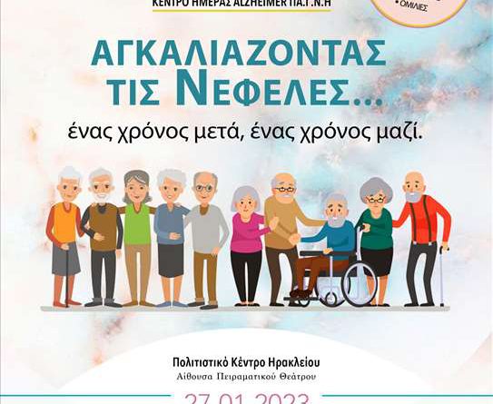 Με αφορμή τη συμπλήρωση ενός έτους λειτουργίας του Κέντρου Ημέρας Alzheimer (ΠΑΓΝΗ) «Νεφέλη», διεξάγεται επιστημονική ημερίδα με αντικείμενο τις τρέχουσες επιστημονικές εξελίξεις στην άνοια, τους προγνωστικούς της παράγοντες καθώς και τα πεπραγμένα του Κέντρου Ημέρας στις 27/1/2023, στο Πολιτιστικό Κέντρο Ηρακλείου .