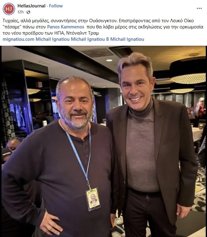 Ο τελευταίος ανέβασε τη φωτογραφία στο λογαριασμό του Hellas Journal στο Facebook, με το σχόλιο «τυχαίες, αλλά μεγάλες συναντήσεις στην Ουάσιγκτον». Ο άλλοτε κυβερνητικός εταίρος του Αλέξη Τσίπρα θα δώσει λοιπόν το «παρών» στη λαμπρή τελετή του Ρεπουμπλικανού προέδρου των Ηνωμένων Πολιτειών.