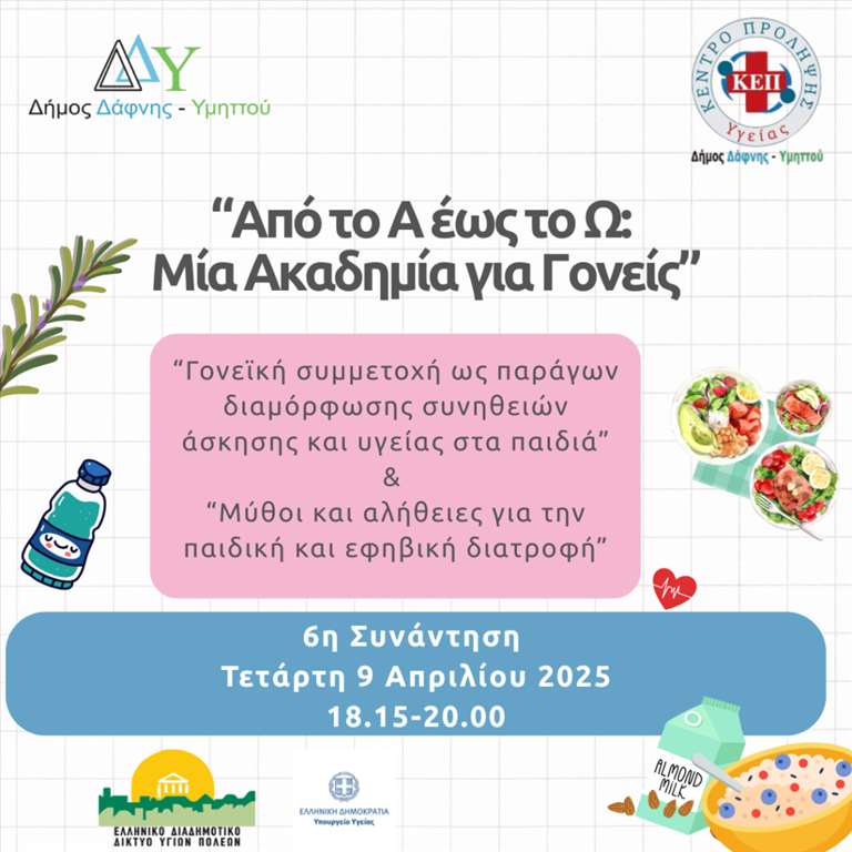 Ο Δήμος Δάφνης-Υμηττού και το ΚΕΠ Υγείας (Κέντρο Πρόληψης Υγείας), σε συνεργασία με το Ελληνικό Διαδημοτικό Δίκτυο Υγιών Πόλεων (ΕΔΔΥΠΠΥ), σας προσκαλούν να παρακολουθήσετε τον φετινό κύκλο των Ακαδημιών Γονέων “Από το Α έως το Ω“, ο οποίος πραγματοποιείται για 10η συνεχή χρονιά από το ΠΜΣ “Στρατηγικές Αναπτυξιακής και Εφηβικής Υγείας” της Ιατρικής Σχολής του Εθνικού και Καποδιστριακού Πανεπιστημίου Αθηνών και την Ελληνική Εταιρεία Εφηβικής Ιατρικής (Ε.Ε.Ε.Ι.).