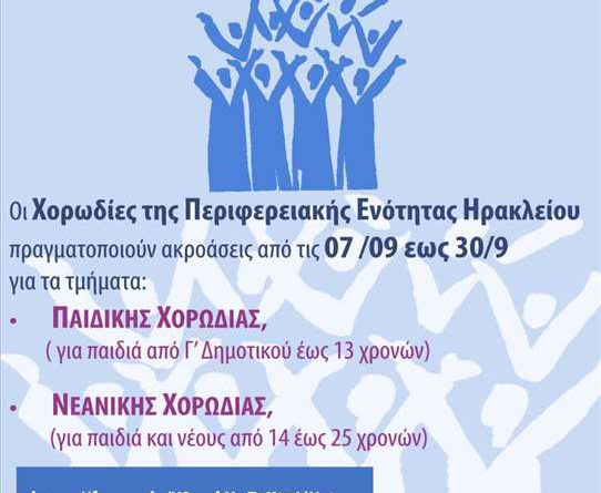 Οι Χορωδίες της Περιφερειακής Ενότητας Ηρακλείου διεξάγουν ακροάσεις για νέα μέλη στα τμήματα: