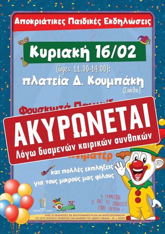 Η προγραμματισμένη αποκριάτικη εκδήλωση του Δήμου Νίκαιας-Αγ.Ι.Ρέντη στην πλατεία Διαμάντως Κουμπάκη για την Κυριακή 16 Φεβρουαρίου στις 11.00 π.μ ακυρώνεται λόγω δυσμενών καιρικών συνθηκών. Για οποιαδήποτε νεότερη ενημέρωση ή πιθανή αναπροσαρμογή του προγράμματος θα υπάρξει σχετική ανακοίνωση. Ακύρωση Αποκριάτικης