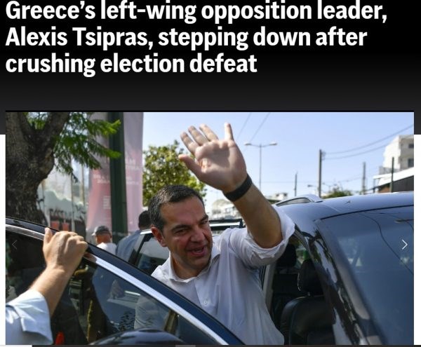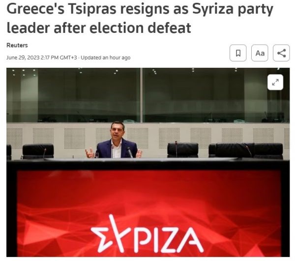 Την ίδια ώρα, ότι «ο Αλέξης Τσίπρας παραιτήθηκε την Πέμπτη από την ηγεσία του αριστερού κόμματος ΣΥΡΙΖΑ ύστερα από τη βαριά ήττα στις εκλογές της Κυριακής», μεταδίδει το Reuters.