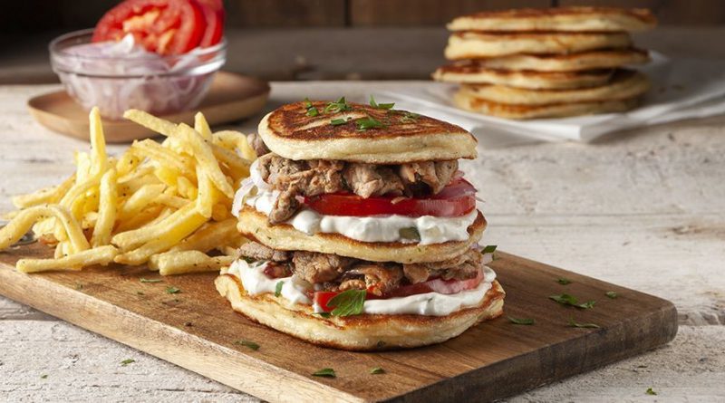 Απλώνουμε 1 κ.σ. τζατζίκι, βάζουμε 1 φέτα ντομάτας, λίγο κρεμμύδι, μαϊντανό, το ¼ από τον γύρο κοτόπουλου και καλύπτουμε με άλλο ένα pancake. Ακολουθούμε την ίδια διαδικασία άλλη μια φορά για να σχηματίζουμε ένα μπέργκερ.