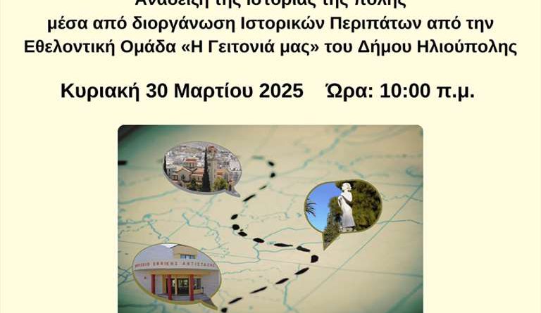 Η Εθελοντική ομάδα «Η Γειτονιά μας» του Δήμου Ηλιούπολης διοργανώνει τον 1ο Ιστορικό Περίπατο της πόλης την Κυριακή 30 Μαρτίου 2025 με ξεναγό τον εθελοντή καθηγητή Ιστορίας του Κοινωνικού Φροντιστηρίου της πόλης μας Κ. Παύλο Παπαθανασίου.