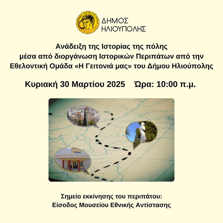 Η Εθελοντική ομάδα «Η Γειτονιά μας» του Δήμου Ηλιούπολης διοργανώνει τον 1ο Ιστορικό Περίπατο της πόλης την Κυριακή 30 Μαρτίου 2025 με ξεναγό τον εθελοντή καθηγητή Ιστορίας του Κοινωνικού Φροντιστηρίου της πόλης μας Κ. Παύλο Παπαθανασίου.