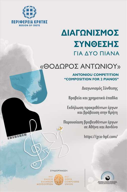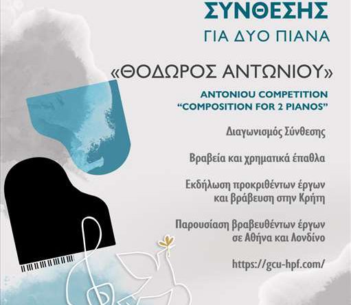 Στα πλαίσια του Διαγωνισμού σύνθεσης με την επωνυμία «Θόδωρος Αντωνίου» 2022 – 2023, για δυο πιάνα που συνδιοργανώνει για πρώτη φορά η Περιφέρεια Κρήτης σε συνεργασία με την Ένωση Ελλήνων Μουσουργών και το Φεστιβάλ Πιάνου Ηρακλείου, θα παρουσιαστούν τα 6 προκριθέντα έργα στις 29 Απριλίου στην αίθουσα «Παντελή Πρεβελάκη» και ώρα 20.00 στο Ρέθυμνο.
