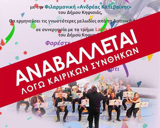 Λόγω δυσμενών καιρικών συνθηκών αναβάλλεται η προγραμματισμένη για το Σάββατο 22 Φεβρουαρίου, στις 12.00 εορταστική εκδήλωση "Αποκριάτικη Συναυλία και Latin Χοροί" του Δήμου Κηφισιάς στο Εμπορικό Κέντρο “Shoppingland”(Κολοκοτρώνη & Λεβίδου, Κηφισιά).