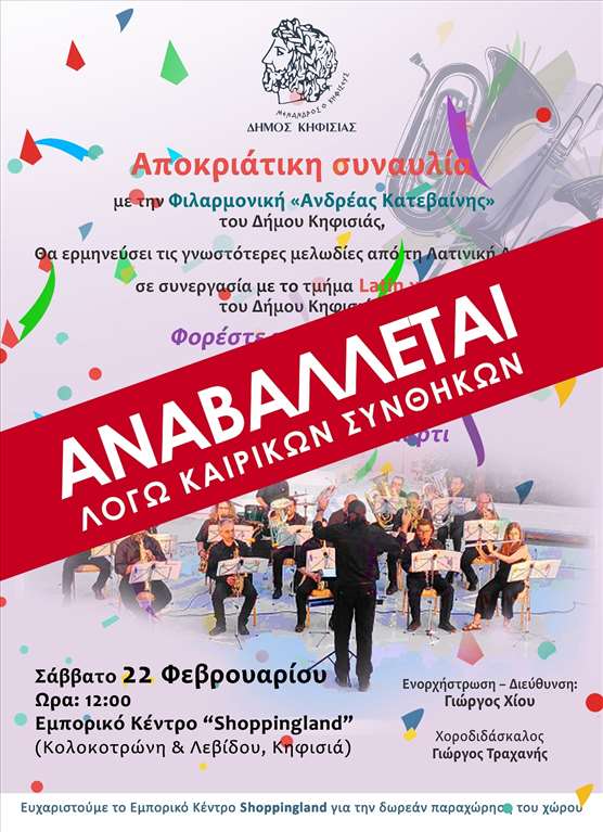 Λόγω δυσμενών καιρικών συνθηκών αναβάλλεται η προγραμματισμένη για το Σάββατο 22 Φεβρουαρίου, στις 12.00 εορταστική εκδήλωση "Αποκριάτικη Συναυλία και Latin Χοροί" του Δήμου Κηφισιάς στο Εμπορικό Κέντρο “Shoppingland”(Κολοκοτρώνη & Λεβίδου, Κηφισιά).