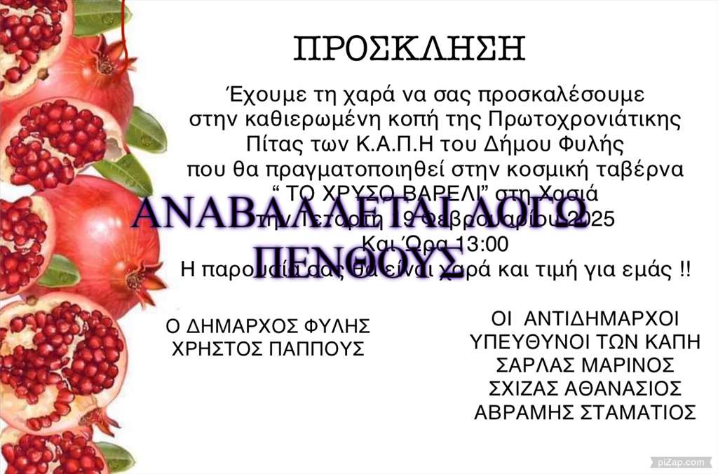 Ο Δήμος Φυλής ανακοινώνει την ΑΝΑΒΟΛΗ ΤΗΣ ΕΚΔΗΛΩΣΗΣ ΓΙΑ ΤΗΝ ΚΟΠΗ ΤΗΣ ΠΡΩΤΟΧΡΟΝΙΑΤΙΚΗΣ ΠΙΤΑΣ ΤΩΝ Κ.Α.Π.Η ως ένδειξη συμπαράστασης στο πένθος της οικογένειας του 15χρονου Νικόλαου Τσεβά που έχασε την ζωή του στο τραγικό δυστύχημα που συνέβη στη Φυλή.