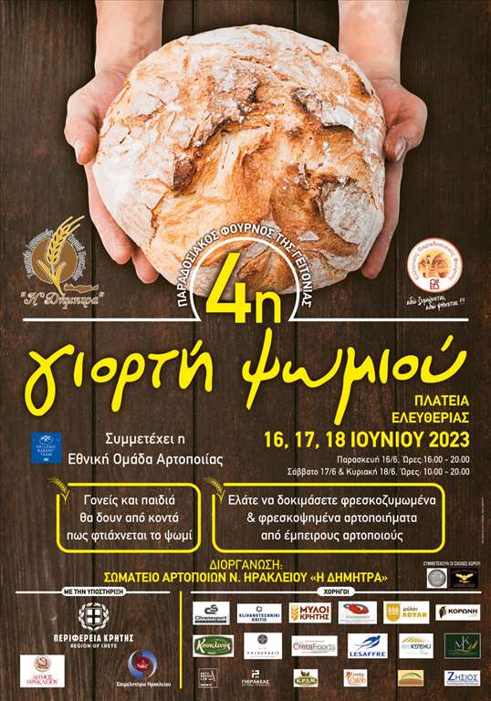 Θα πραγματοποιηθεί στην Πλατεία Ελευθερίας με τη συμμετοχή και της Εθνικής Ομάδας Αρτοποιίας, η οποία προετοιμάζεται για τη συμμετοχή της στο Παγκόσμιο Πρωτάθλημα το 2024 στο Παρίσι. Μαζί με αρτοποιούς του Ηρακλείου, δύο από τους οποίους ανήκουν στην Εθνική Ομάδα, θα παρασκευάσουν ψωμί σε διάφορους τύπους, παραδοσιακά αρτοσκευάσματα, αλλά και ευρωπαϊκά γλυκίσματα και αρτοποιήματα. Μέρος των παρασκευασμάτων αυτών θα προσφέρονται δωρεάν στους επισκέπτες, ενώ μερικά από αυτά θα πωληθούν έναντι συμβολικού τιμήματος, από τον Παγκρήτιο Σύλλογο Γονέων & Φίλων Παιδιών με Νεοπλασία "ΗΛΙΑΧΤΙΔΑ" και το Εθελοντικό Σωματείο Α.Τ.Α.Χ.Τ.Ο.Ι. για την κάλυψη μέρους των εξόδων τους, το Σάββατο και την Κυριακή, αντίστοιχα, στον χώρο της Γιορτής.