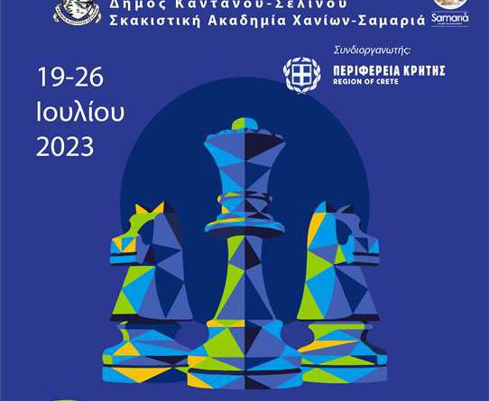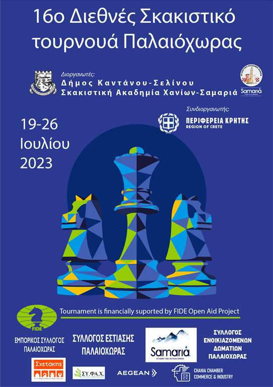 Ο Δήμος Καντάνου Σελίνου και η Σκακιστική Ακαδημία Χανίων «ΣΑΜΑΡΙΑ» πραγματοποιούν με την υποστήριξη της Περιφέρειας Κρήτης το 16ο διεθνές σκακιστικό τουρνουά Παλαιόχωρας.