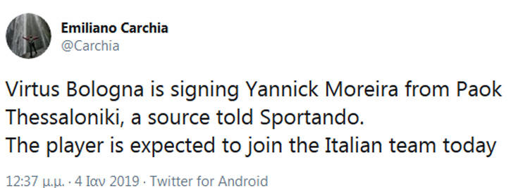 «Η Βίρτους Μπολόνια είναι κοντά στο να υπογράψει συμβόλαιο με τον Γιανίκ Μορέιρα του ΠΑΟΚ Θεσσαλονίκης, αναφέρει πηγή του Sportando. Ο παίκτης αναμένεται σήμερα να ενταχθεί στο δυναμικό της ομάδας», αναφέρει με tweet του ο δημοσιογράφος, Εμιλιάνο Κάρκια, που είχε και μπόλικο από το ρεπορτάζ που αφορούσε τη μεταγραφή του Τζόρνταν Θίοντορ στην ΑΕΚ.