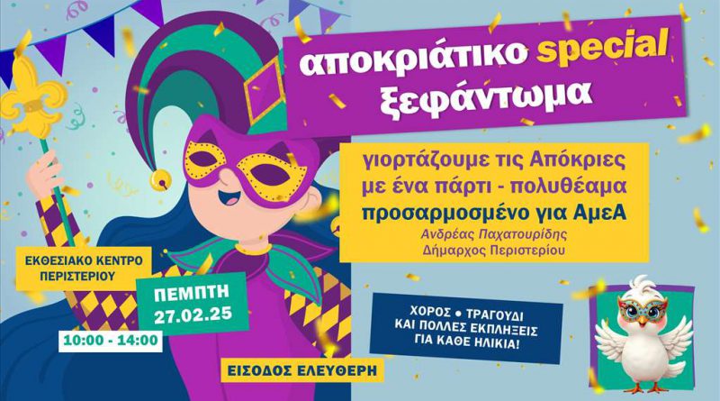 Ο Δήμαρχος Περιστερίου Ανδρέας Π. Παχατουρίδης, σας προσκαλεί στη μοναδική αποκριάτικη εκδήλωση για άτομα με αναπηρίες, την Πέμπτη 27 Φεβρουαρίου 2025, ώρες 10:00 – 14:00 στο Εκθεσιακό Κέντρο Περιστερίου. Είσοδος Ελεύθερη!