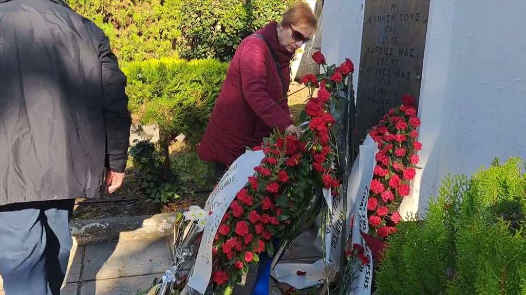 Λίγα κόκκινα τριαντάφυλλα και με τα κεφάλια σκυμμένα ένα ζευγάρι αποτίει φόρο αιώνιας μνήμης και τιμής στους νεκρούς αλλά και σε όλους τους φοιτητές του Πολυτεχνείου που αγωνίστηκαν για να πέσει η Χούντα πριν από 51 χρόνια.
