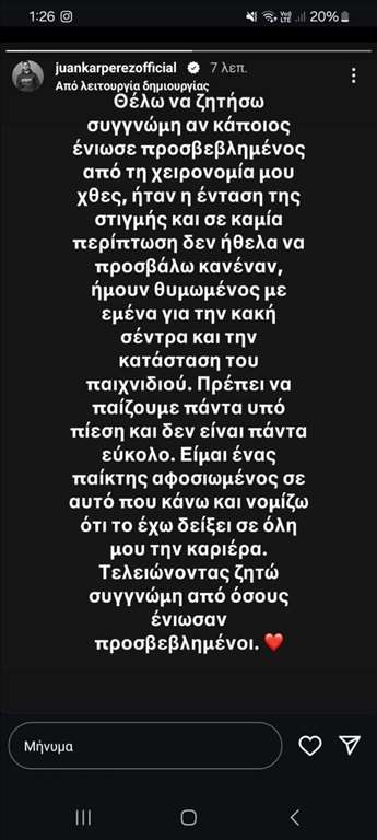 Απολογητική ανάρτηση, με αφορμή χειρονομία, η οποία έγινε αντιληπτή από μερίδα του κόσμου στο ματς με τον ΟΦΗ, έκανε σήμερα Δευτέρα 6 Ιανουαρίου ο Χουάνκαρ. Ο παίκτης του Άρη ζητά συγγνώμη, δικαιολογώντας την κίνησή του, λέγοντας ότι τα έβαλε με τον εαυτό του, μετά από μία άστοχη σέντρα, και πως δεν ήθελε να προσβάλλει κανέναν. Μάλιστα, κάποιοι φίλοι του Άρη τα έβαλαν με τον Ισπανό, στα κοινωνικά δίκτυα, μη αποδεχόμενοι και όντες εκνευρισμένοι με τη συμπεριφορά του.