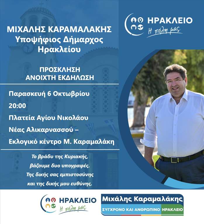 «Μια μακρά προεκλογική πορεία κλείνει το βράδυ της Παρασκευής 6, Οκτωβρίου με την ανοιχτή εκδήλωση μας στην πλατεία του Αγίου Νικολάου στο εκλογικό κέντρο της Νέας Αλικαρνασσού. Απευθύνουμε κάλεσμα σε όλους τους δημότες να δώσουν το «παρών» έξω από το εκλογικό μας κέντρο στη Νέα Αλικαρνασσό για να σφραγίσουμε την υπόσχεση που έδωσα πριν από 87 ημέρες οπότε και ανακοίνωσα την υποψηφιότητά μου για την διεκδίκηση του Δήμου Ηρακλείου».