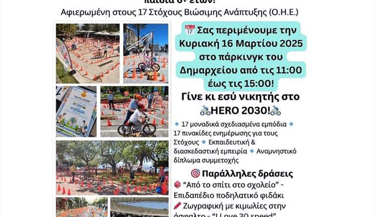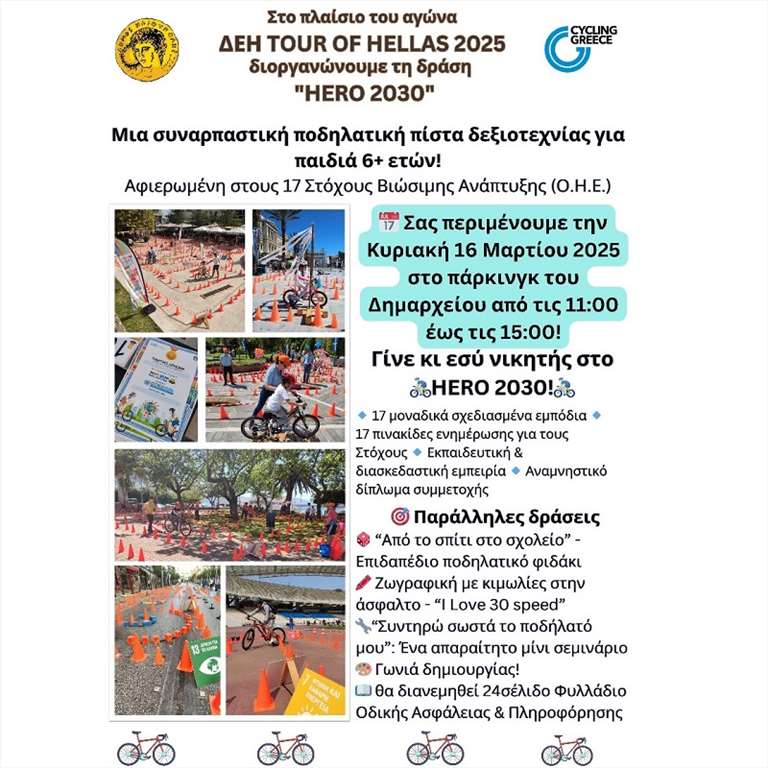 Ο Δήμος Ηλιούπολης, σε συνεργασία με την Cycling Greece, διοργανώνει τη δράση “HERO 2030” στο πλαίσιο του ΔΕΗ TOUR OF HELLAS 2025. Πρόκειται για μια συναρπαστική ποδηλατική πίστα δεξιοτεχνίας, ειδικά σχεδιασμένη για παιδιά ηλικίας 6 ετών και άνω, με στόχο την εκπαίδευση και την ευαισθητοποίησή τους γύρω από την οδική ασφάλεια και τη βιώσιμη ανάπτυξη. Η εκδήλωση είναι αφιερωμένη στους 17 Στόχους Βιώσιμης Ανάπτυξης του ΟΗΕ, προωθώντας τη σημασία της οικολογικής μετακίνησης και της υπεύθυνης συμπεριφοράς στους δρόμους.