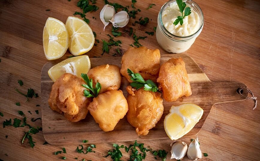 Βουτήξτε το μπακαλιάρο στο κουρκούτι και τηγανίστε σε δυνατή φωτιά μέχρι να αποκτήσει χρυσαφένιο χρώμα.