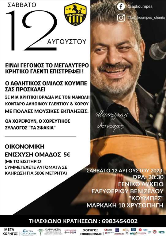 Σάββατο 12 Αυγούστου 2023 και ώρα 20.30 ο Αθλητικός όμιλος “AO ΚΟΥΜΠΕ” σας προσκαλεί σε μια κρητική βραδιά Αληθινού Γλεντιού και πολλές μουσικές εκπλήξεις,