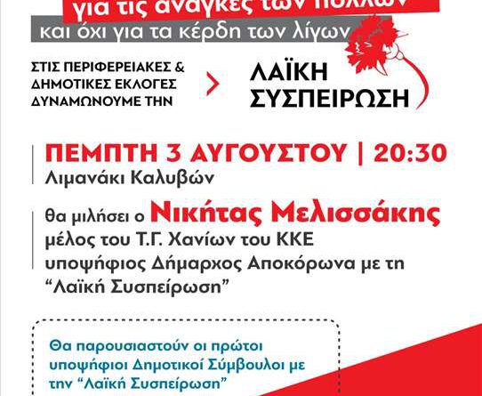 Οι Κομματικές Οργανώσεις Αποκόρωνα του ΚΚΕ, οργανώνουν πολιτική συγκέντρωση-συνεστίαση την Πέμπτη 3 Αυγούστου, στο λιμανάκι Καλυβών, στις 8:30 μ.μ..