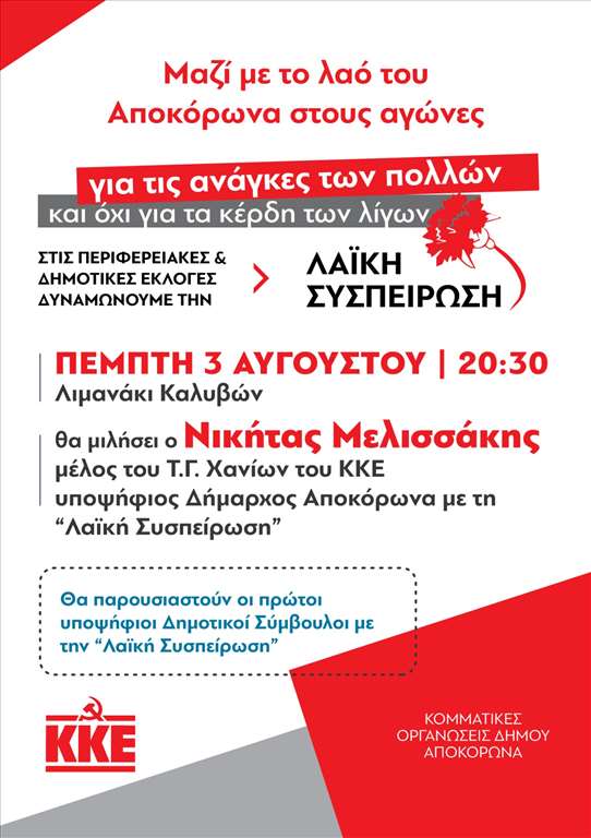 Οι Κομματικές Οργανώσεις Αποκόρωνα του ΚΚΕ, οργανώνουν πολιτική συγκέντρωση-συνεστίαση την Πέμπτη 3 Αυγούστου, στο λιμανάκι Καλυβών, στις 8:30 μ.μ..