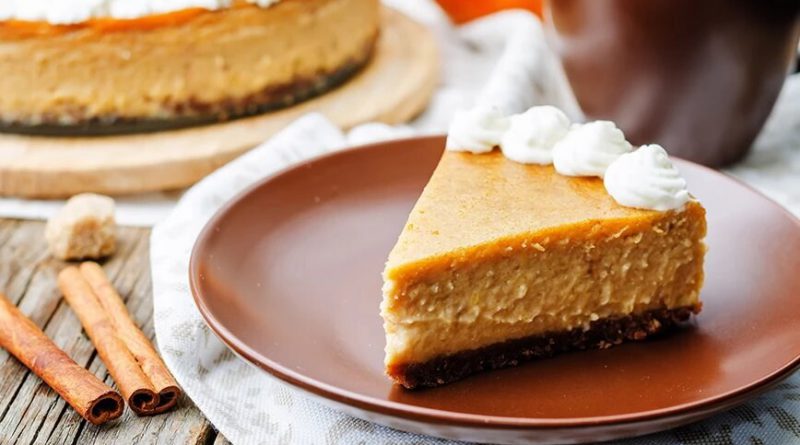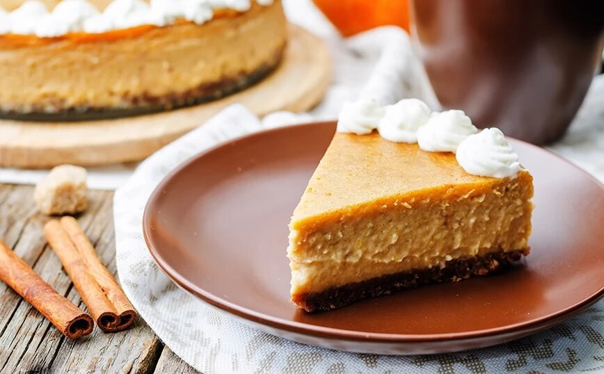 Σε ένα άλλο μπολ, ανακατέψτε τα αυγά, την κολοκύθα, το γάλα, τη ζάχαρη, την κανέλα, το τζίντζερ, το μοσχοκάρυδο και το αλάτι και απλώστε πάνω από το μείγμα κρέμας τυριού.