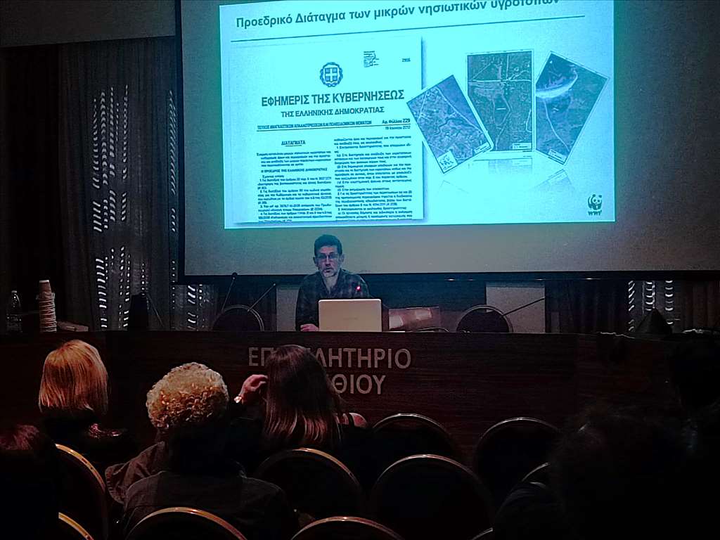 Στη συνέχεια ο κος Θάνος Γιαννακάκης, συντονιστής δράσεων για «Λύσεις βασισμένες στη φύση» του WWF Ελλάς, έδειξε το έργο της περιβαλλοντικής οργάνωσης για τους Μικρούς Νησιωτικούς Υγρότοπους μέχρι την έκδοση του Προεδρικού Διατάγματος 229/2012 αλλά και του ομόφωνου ψηφίσματος κατά την 12η σύνοδο της σύμβασης Ραμσάρ για την προστασία των Μεσογειακών Νησιωτικών Υγρότοπων, παρουσιάζοντας τους υγρότοπους της Ανατολικής Κρήτης και των προβλημάτων που αντιμετωπίζουν και αναφέροντας ενδιαφέρουσες ανέκδοτες ιστορίες που παρουσιάστηκαν μέχρι την επιτυχή έκβαση της όλης προσπάθειας.