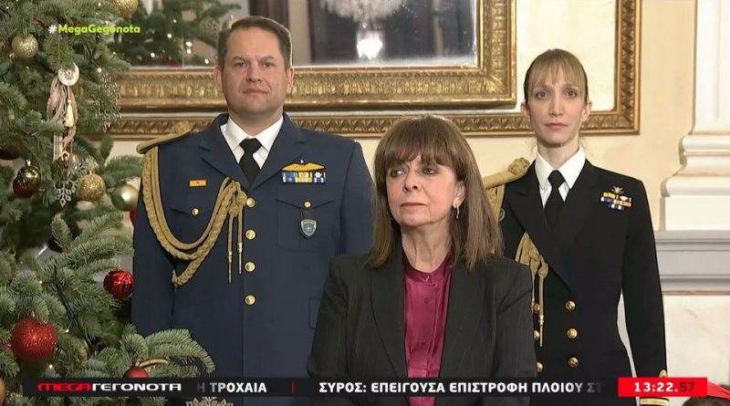 Η προεδρική φρουρά έψαλε τα καθιερωμένα κάλαντα της παραμονής των Χριστουγέννων στην Κατερίνα Σακελλαροπούλου.