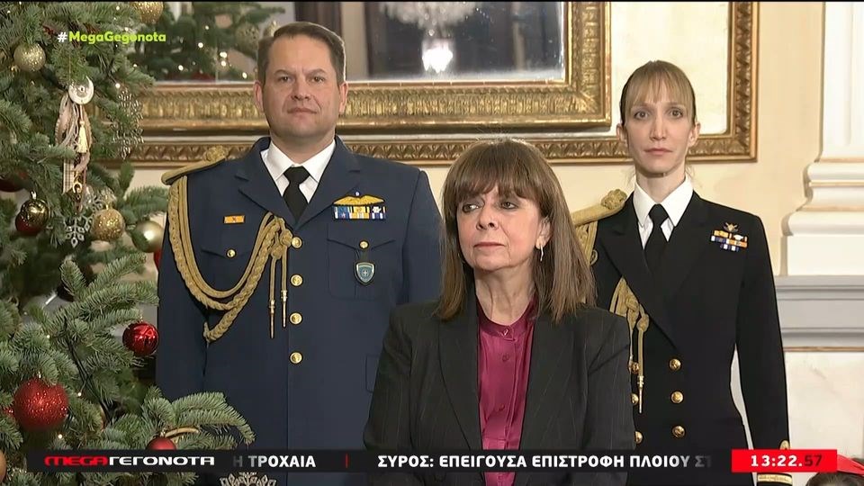 Η προεδρική φρουρά έψαλε τα καθιερωμένα κάλαντα της παραμονής των Χριστουγέννων στην Κατερίνα Σακελλαροπούλου.
