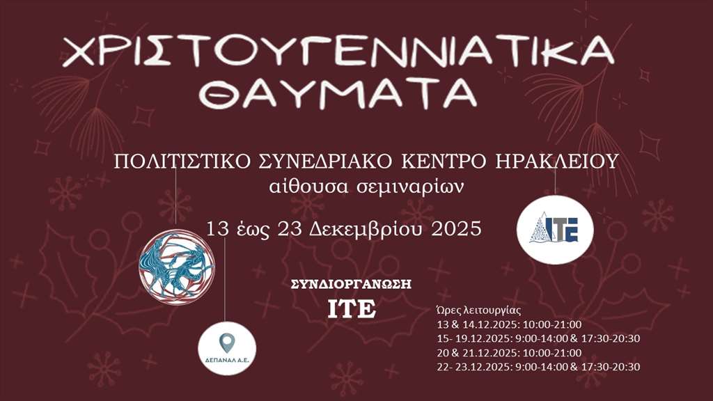 Με τα χρώματα των γιορτών έχει στολιστεί το Πολιτιστικό Συνεδριακό Κέντρο Ηρακλείου, που άνοιξε τις πόρτες του σε μικρούς και μεγάλους για να απολαύσουν τα μικρά θαύματα των Χριστουγέννων με την πολύτιμη στήριξη και τεχνογνωσία του Ιδρύματος Τεχνολογίας Έρευνας!