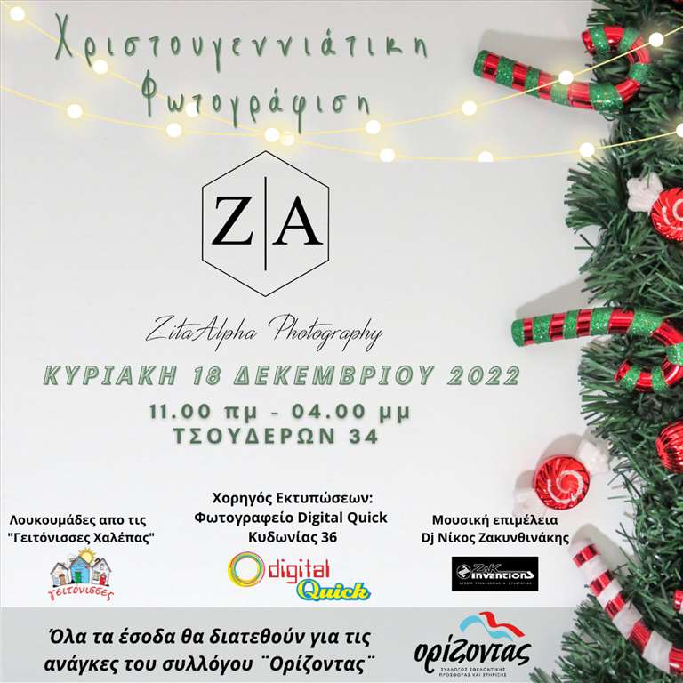 Την Κυριακή 18 Δεκεμβρίου 2022 θα πραγματοποιηθεί Χριστουγεννιάτικη Φωτογράφιση για την στήριξη των οικογενειών του «Ορίζοντα». Οι φωτογράφοι Ζαχάρης Ανδρεαδάκης και Γιώργος Ζακυνθινάκης από την Zita Alpha Photography για μία ακόμη φορά είναι δίπλα στο έργο του «Ορίζοντα» και στις οικογένειες παιδιών και ενηλίκων που πάσχουν από καρκίνο.