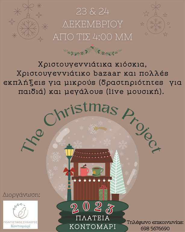 Φέτος τα χριστούγεννα ο Πολιτιστικός Σύλλογος Κοντομαρί διοργανώνει ένα διήμερο γεμάτο εκπλήξεις για μικρούς και μεγάλους στην αγαπημένη μας πλατεία στο Κοντομαρί το Σάββατο 23 και τη Κυριακή 24 Δεκεμβρίου 2023 από τις 16:00 το απόγευμα κι έπειτα.