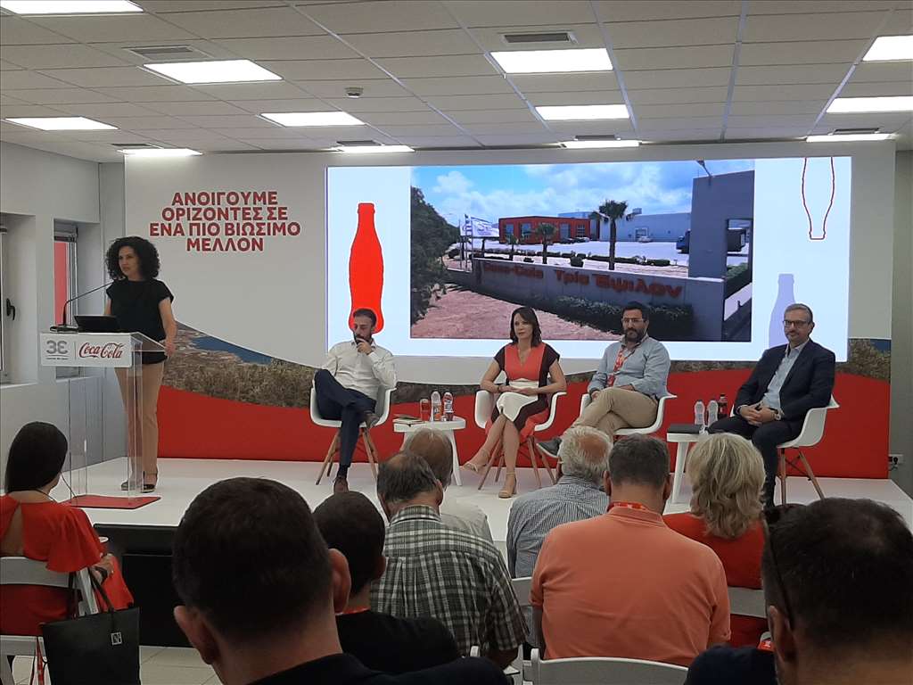 Στην εκδήλωση που έλαβε χώρα στη μονάδα παραγωγής της Coca-Cola στην ΒΙΠΕ Ηρακλείου με σύνθημα «Ανοίγουμε ορίζοντες σ’ ένα πιο βιώσιμο μέλλον-Επιστρέφουμε αξία στην Κρήτη», μίλησαν οι: Μαρία Αναργύρου-Νίκολιτς, γενική διευθύντρια Coca-Cola Τρία Εψιλον Ελλάδα & Κύπρο, Σταύρος Μουρελάτος γενικός διευθυντής Coca Cola Hellas, Βαγγέλης Κωνσταντιανός εκτελεστικός γραμματέας Global Water Partnership-Mediterranean ενώ ακολούθησε ξενάγηση στον χώρο του εργοστασίου.