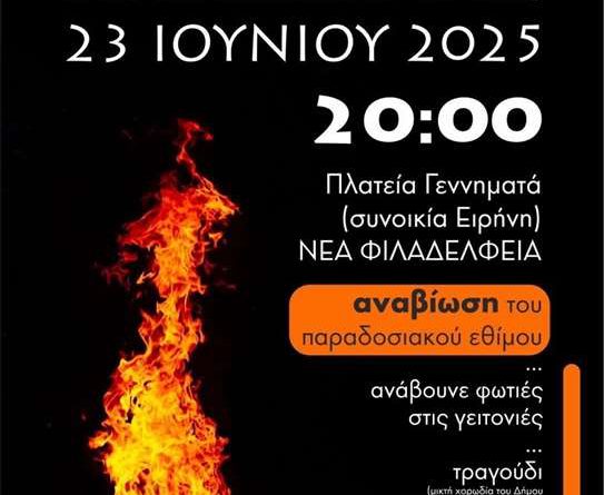 Ο Δήμος Νέας Φιλαδέλφειας – Νέας Χαλκηδόνας προσκαλεί τους πολίτες στη γιορτή του Αϊ Γιάννη τον Κλήδονα, τη Δευτέρα 23 Ιουνίου 2025 στις 20:00, στην Πλατεία Γεννηματά (συνοικία Ειρήνη) στη Νέα Φιλαδέλφεια.