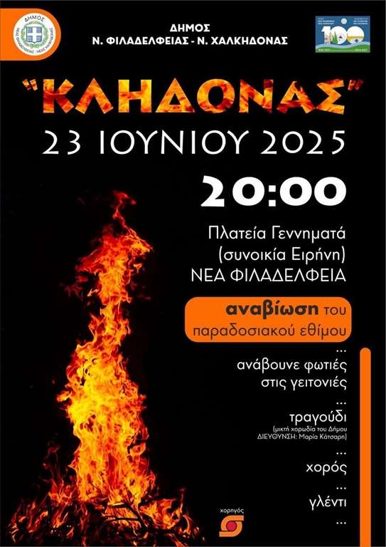 Ο Δήμος Νέας Φιλαδέλφειας – Νέας Χαλκηδόνας προσκαλεί τους πολίτες στη γιορτή του Αϊ Γιάννη τον Κλήδονα, τη Δευτέρα 23 Ιουνίου 2025 στις 20:00, στην Πλατεία Γεννηματά (συνοικία Ειρήνη) στη Νέα Φιλαδέλφεια.