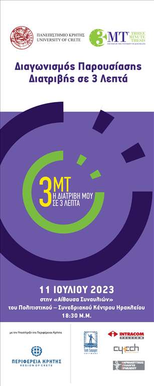 Αύριο Τρίτη 11 Ιουλίου 2023 και ώρα 6:30 μ.μ. θα πραγματοποιηθεί στην «Αίθουσα Συναυλιών» του Πολιτιστικού Συνεδριακού Κέντρου Ηρακλείου η Τελική Φάση του Διαγωνισμού «Η διατριβή μου σε 3 λεπτά – 3 Minute Thesis» που διοργανώνει το Πανεπιστήμιο Κρήτης, υπό την αιγίδα του Πρύτανη του Ιδρύματος Καθηγητή Γεωργίου Μ. Κοντάκη και με την υποστήριξη της Περιφέρειας Κρήτης.