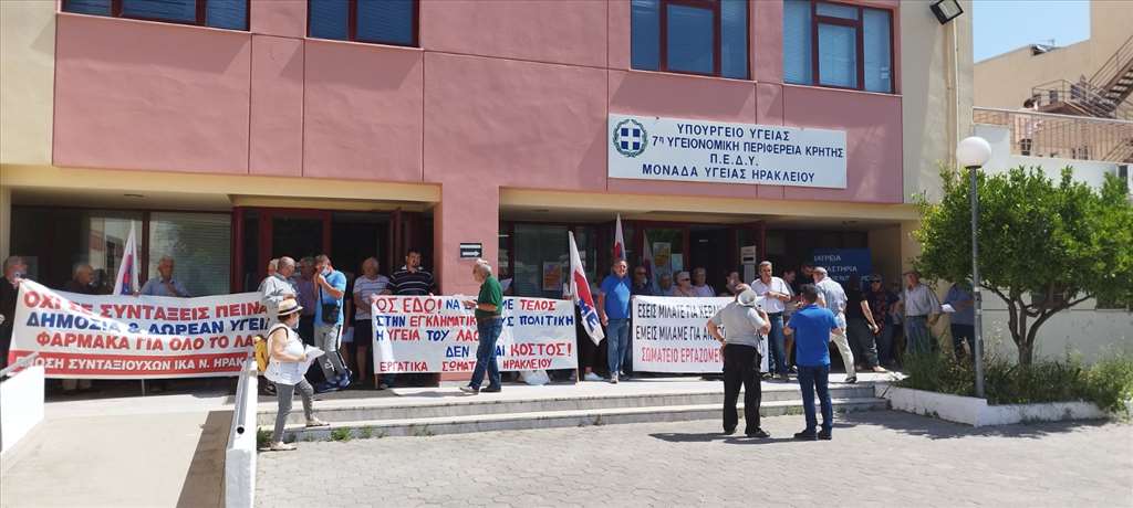 Παράσταση διαμαρτυρίας πραγματοποίησαν σήμερα τα σωματεία: Ένωση Ιδιωτικών Υπαλλήλων Ηρακλείου, Συνδικάτο οικοδόμων Ν.Ηρακλείου, το Συνδικάτο γάλακτος τροφίμων και ποτών και το σωματείο εργαζομένων ΠΑΓΝΗ και η Ένωση Συνταξιούχων ΙΚΑ Ηρακλείου στην 7η ΥΠΕ.